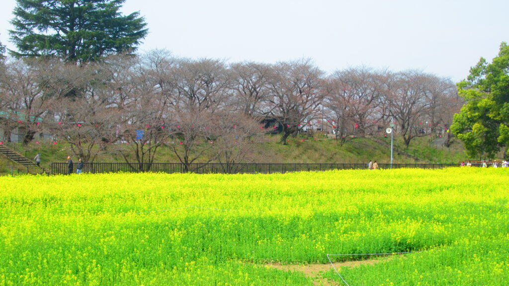遠方のソメイヨシノは昨日開花しましたが、ご覧のようにまだ蕾が9割以上でも何となくピンクがかって観えます。手前の菜の花はすでに見頃が近くなりました。