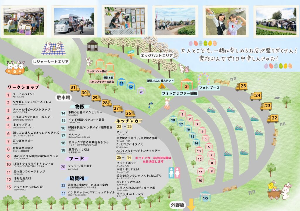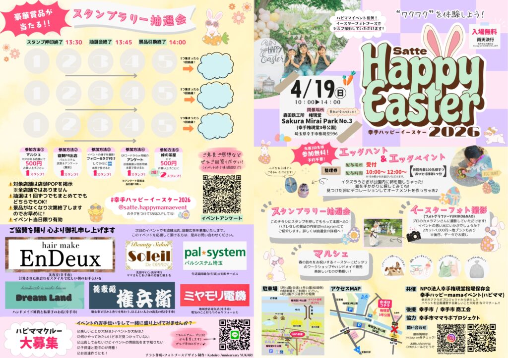 春がいっぱい! 権現堂3号公園で今年も4月19日に「ハッピーイースター」を開催します! 柔らかい日差しの中、お子さんと一緒に春の訪れを楽しみませんか? 大人も子供も夢中になれるアクティビティ、グルメが盛りだくさんです。